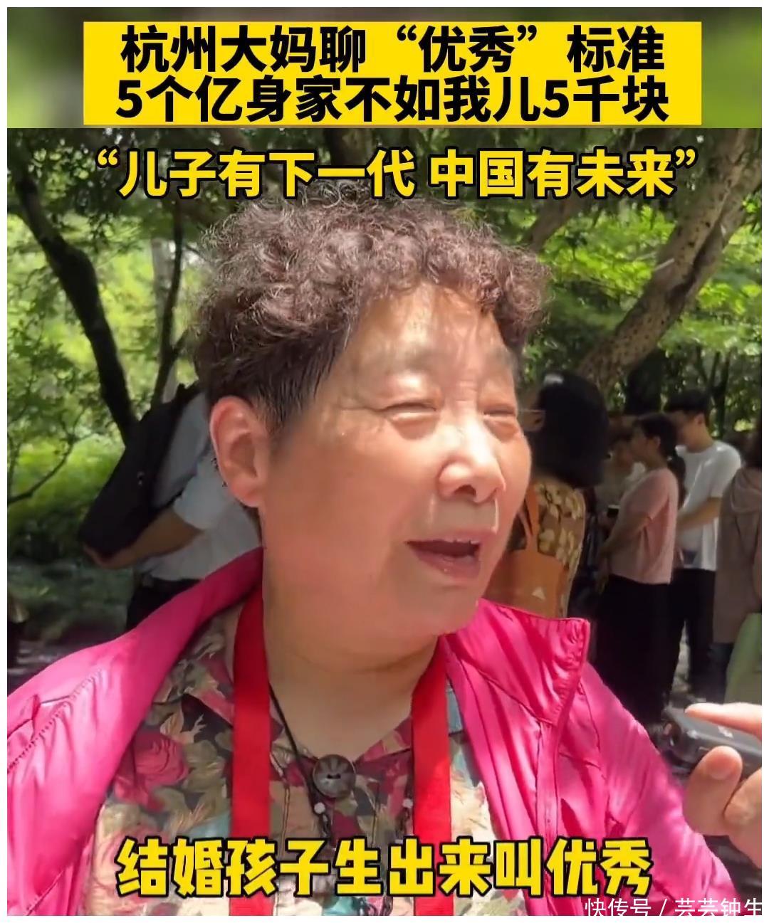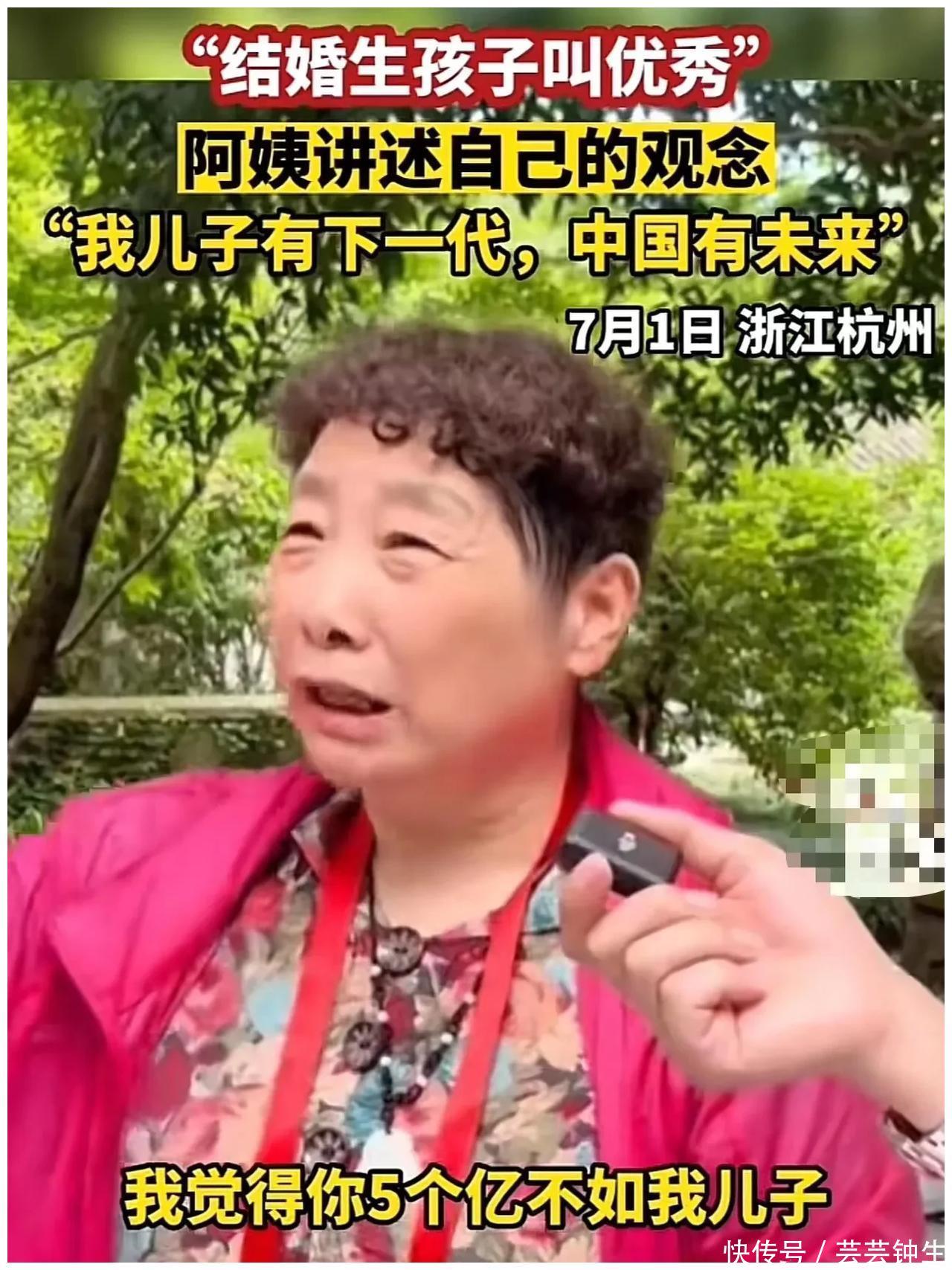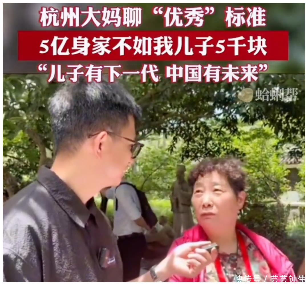 7月1日,杭州别称大妈上了热搜,因为她说别东说念主身家五个亿不如她犬子月薪5000,大妈敢这么说,那一定有原因 大妈随后作念了说明,大妈说“孩子生出来才算优秀,这么犬子有后代,中国有改日”